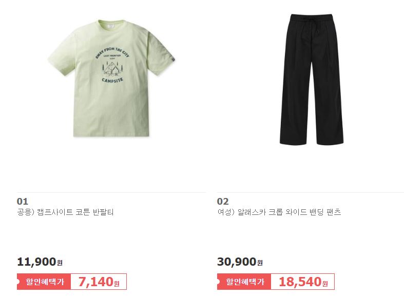 할인 품목 : 티셔츠, 팬츠, 셔츠 등