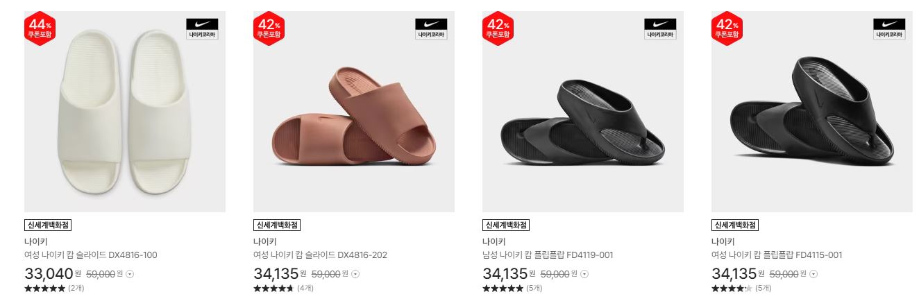 할인 품목 : 티셔츠, 팬츠, 운동화, 슬리퍼 등