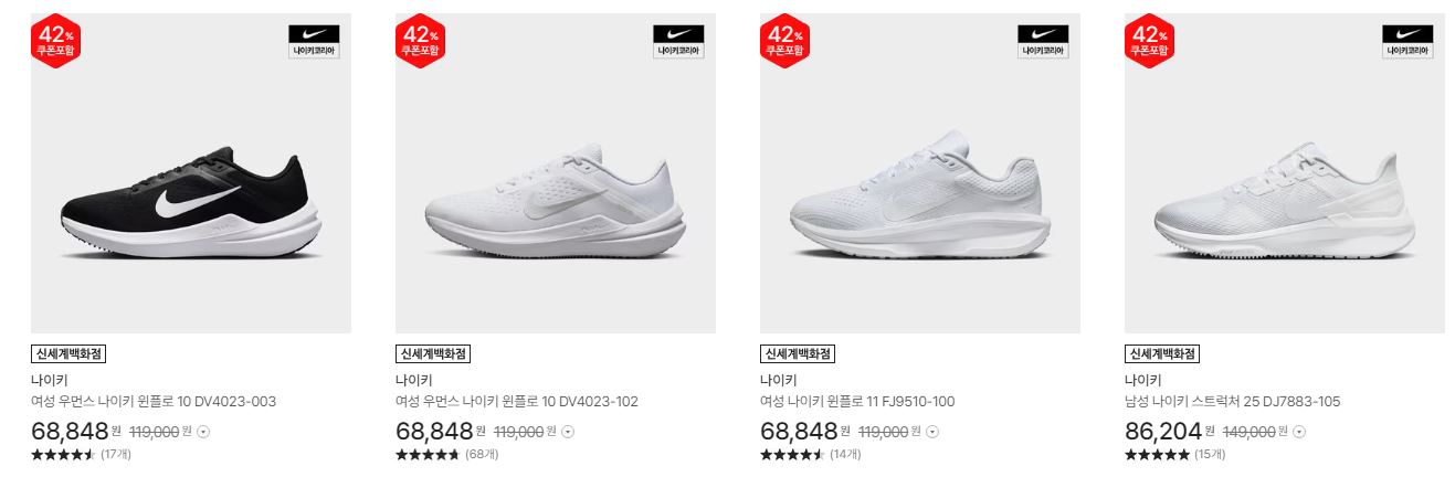 나이키 다양한 제품을 할인 판매하네요.