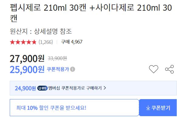펩시제로 210ml 30캔 + 사이다제로 210ml 30캔 할인 정보 [링크]