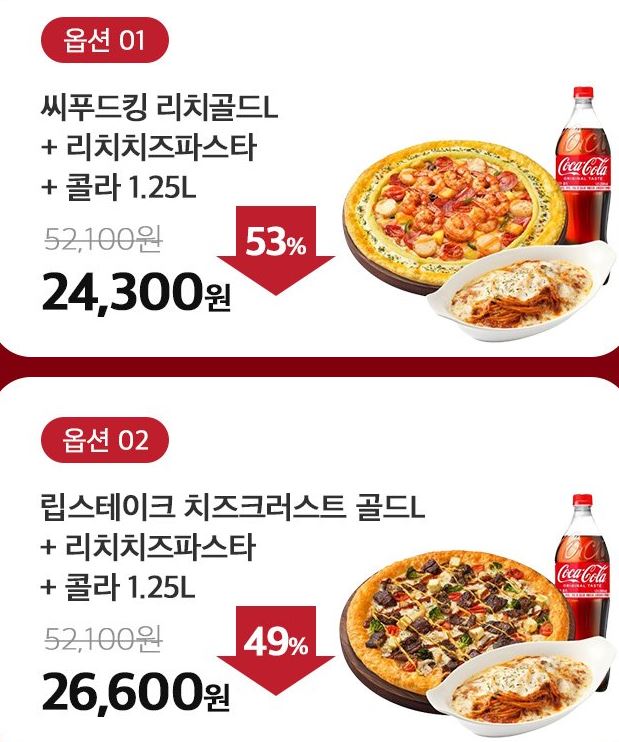 할인 메뉴 : 씨푸드킹 리치골드+리치치즈파스타+콜라 등