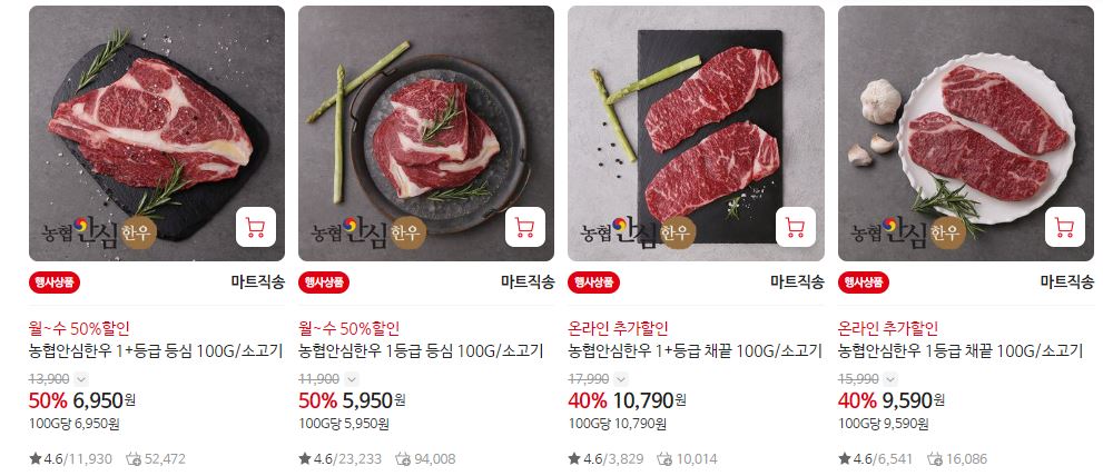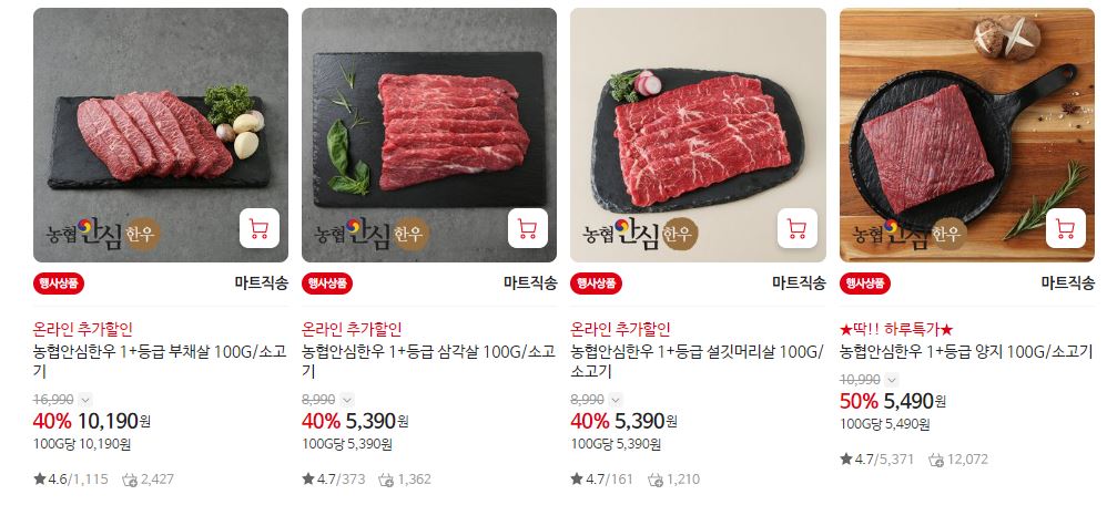 할인 품목 : 등심, 채끝, 치마살 등