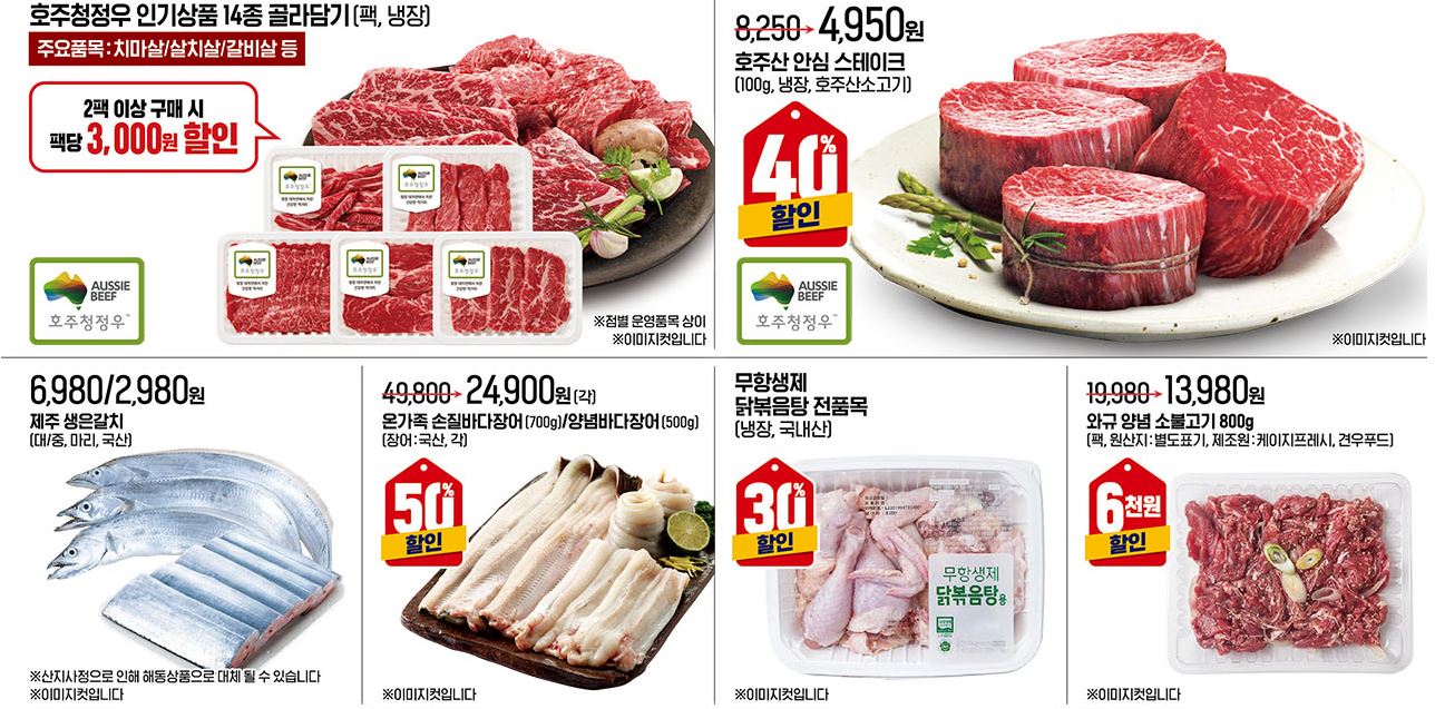 할인 품목 : 오징어, 삼겹살, 과일 등