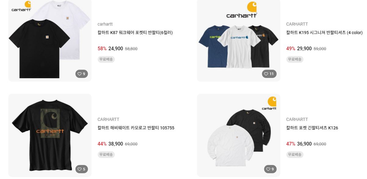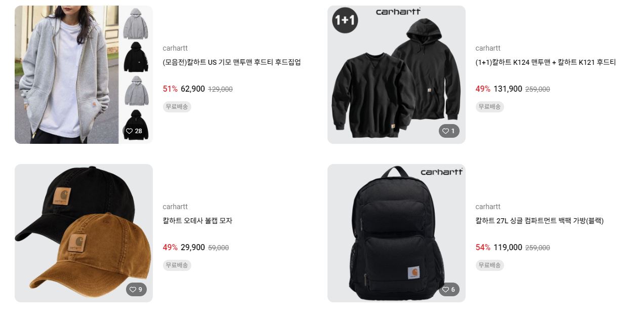 칼하트 다양한 제품을 할인 판매하네요.