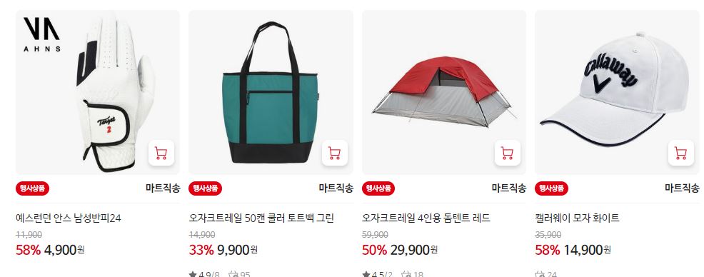 할인 품목 : 양말, 텐트, 골프공, 슬리퍼 등