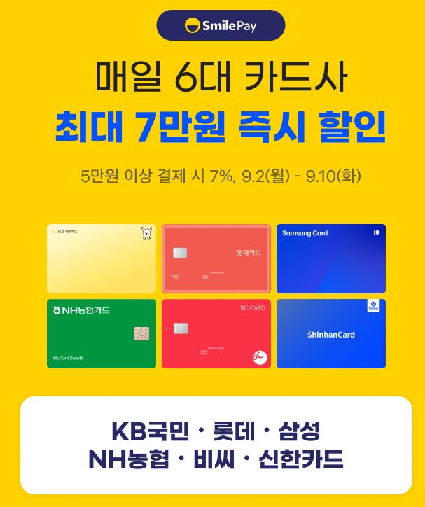 매일 6대 카드사 5만원 이상 결제 시 7% 할인