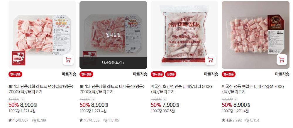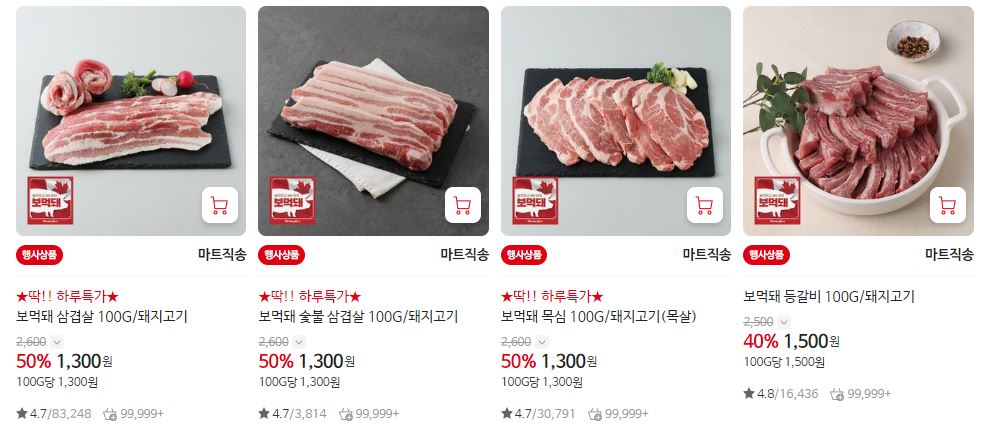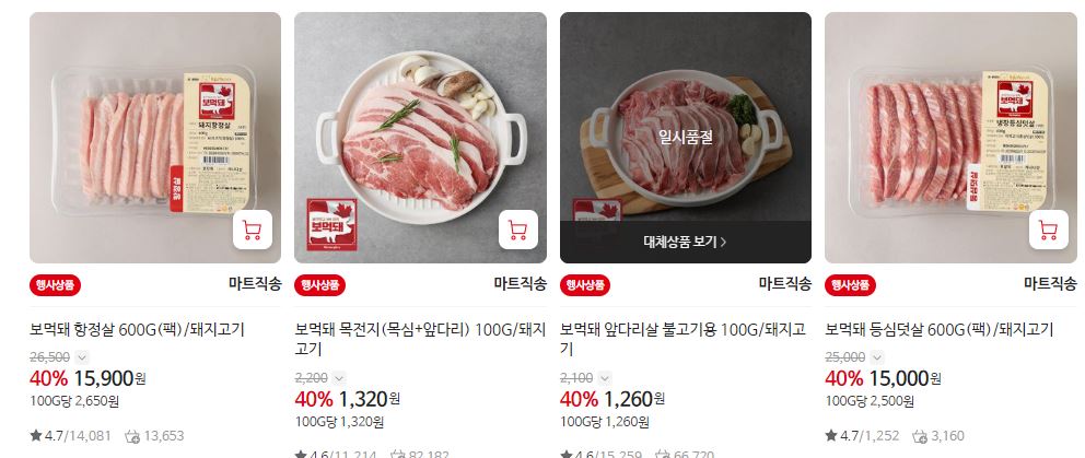 할인 품목 : 삼겹살, 목심, 등갈비 등