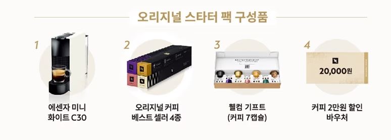 구성 : 에센자 미니 화이트 C30, 오리지널커피 베스트셀러 4종, 웰컴기프트, 커피 2만원 바우처
