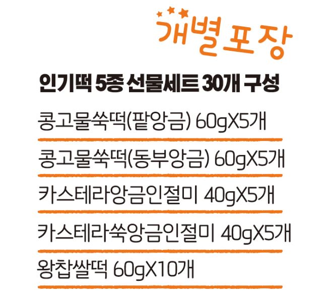 구성 : 콩고물쑥떡, 카스테라앙금인절미 등
