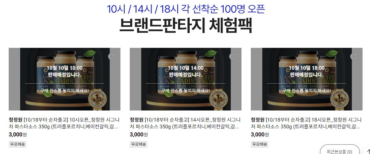 10시 14시 18시 선착순 100명 체험팩 판매