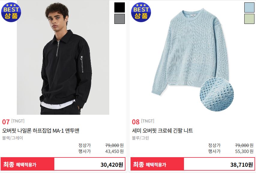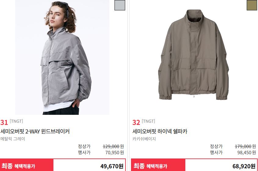 할인 품목 : 맨투맨, 니트, 자켓 등