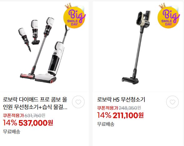 할인 품목 : 로봇청소기, 무선청소기