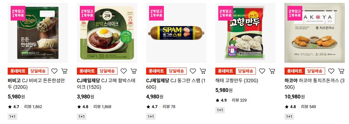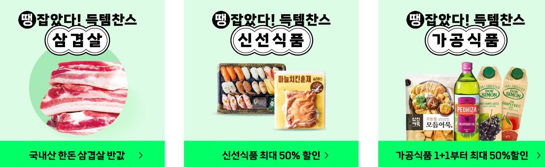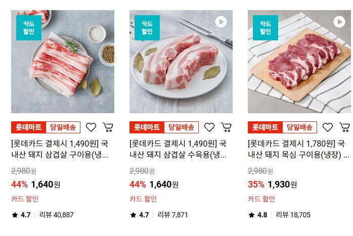 할인 품목 : 삼겹살, 만두, 함박스테이크 등
