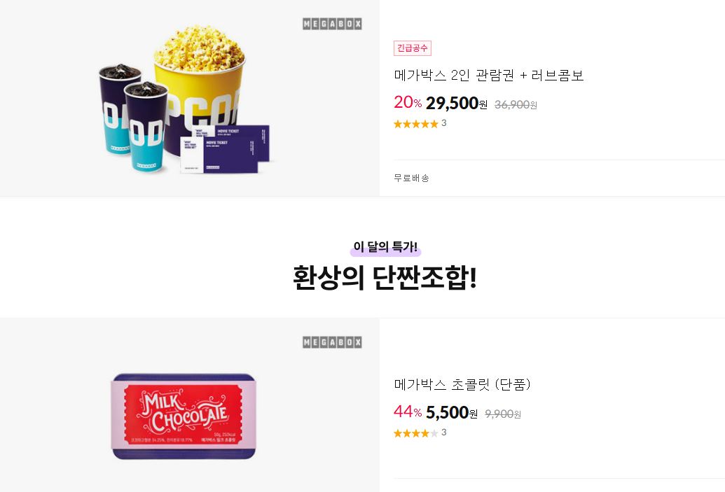 메가박스 다양한 제품을 할인 판매하네요.