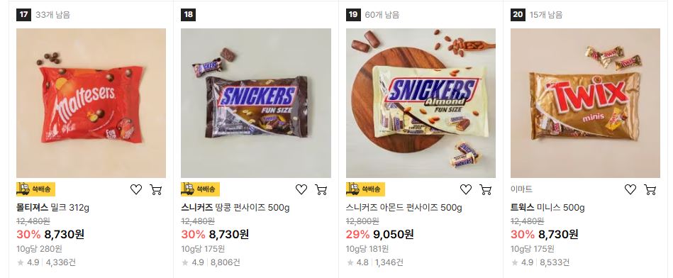 할인 품목 : 연양갱, 사탕, 스니커즈 등