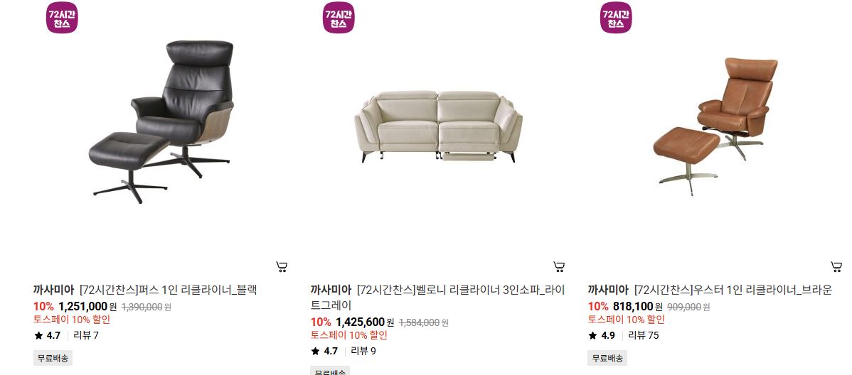 할인 품목 : 소파, 리클라이너, 매트리스 등