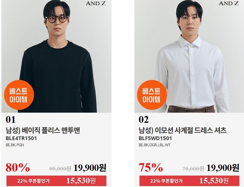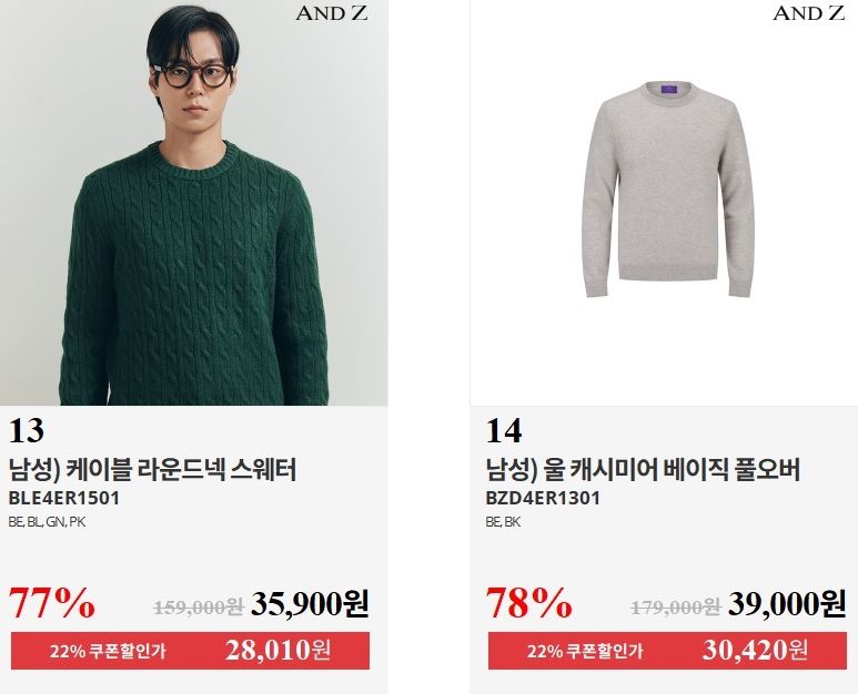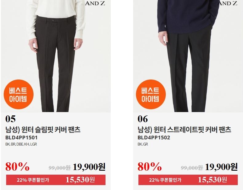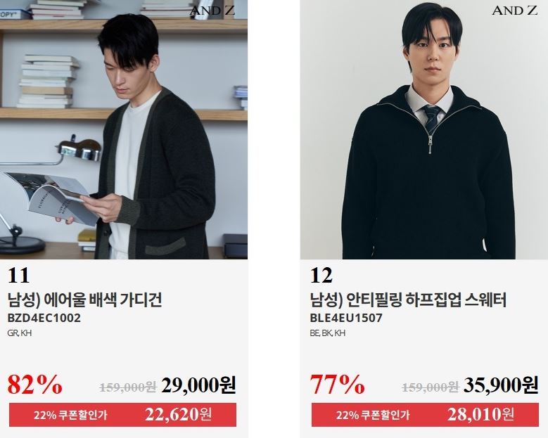 할인 품목 : 맨투맨, 니트, 팬츠 등
