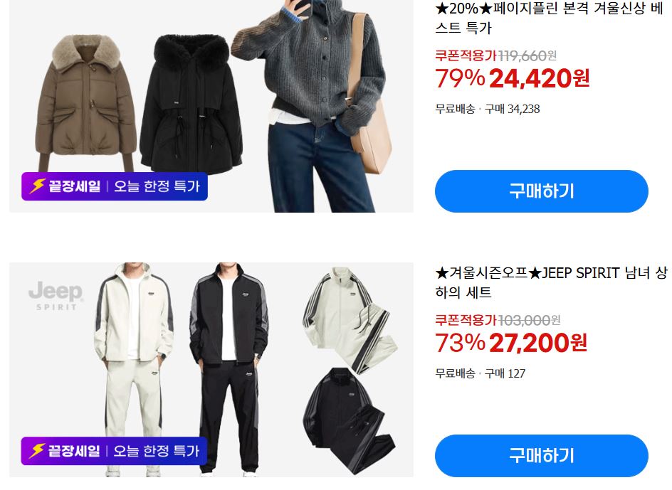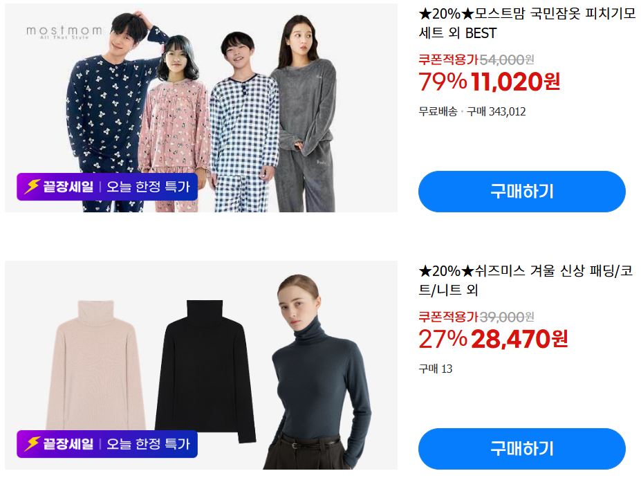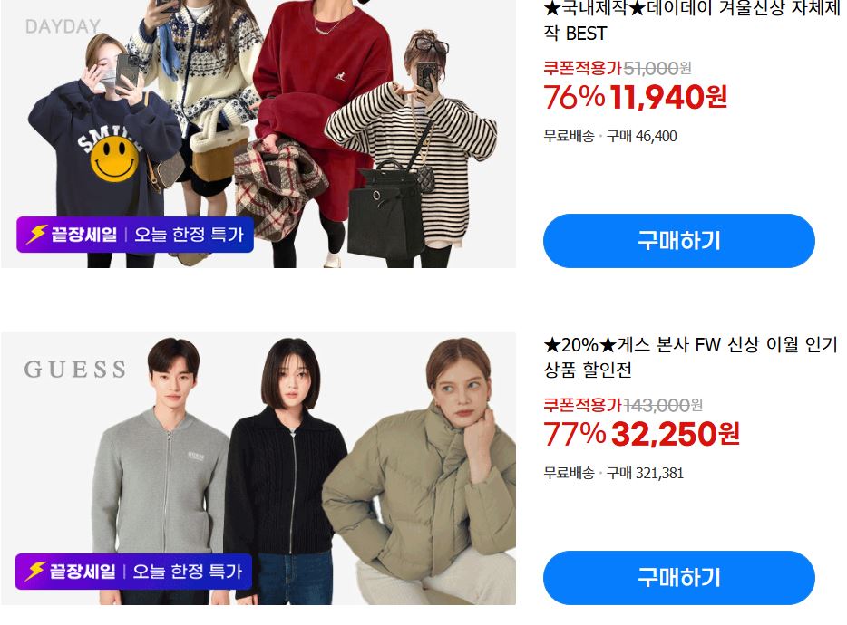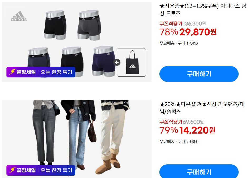 할인 품목 : 티셔츠, 점퍼, 언더웨어 등