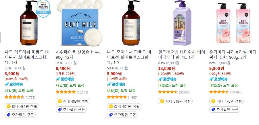 할인 품목 : 샴푸, 바디워시, 세재, 치약 등
