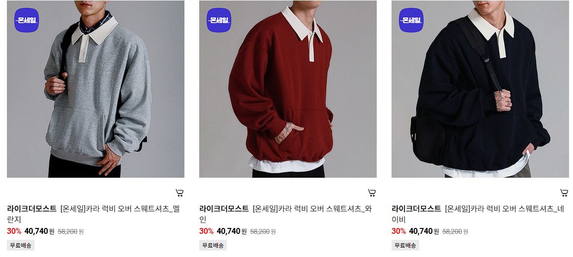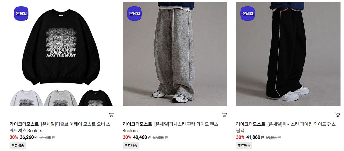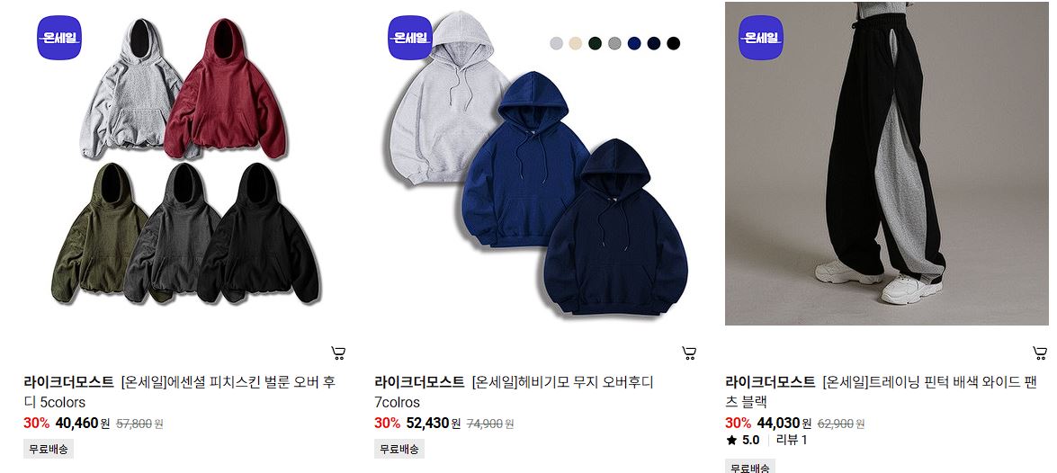 할인 품목 : 후드티, 맨투맨, 팬츠 등