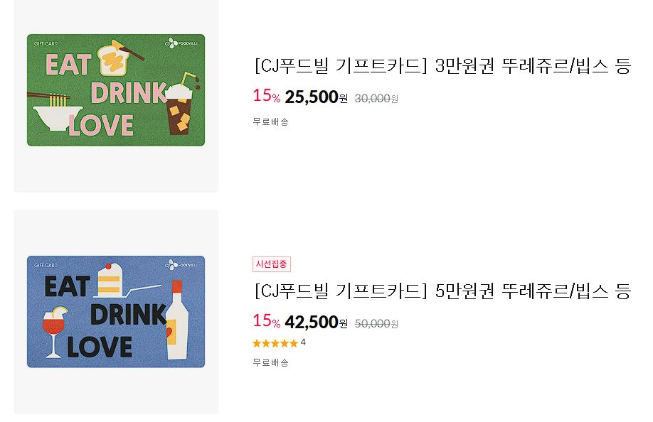 CJ푸드빌 기프트카드 15% 할인 판매하네요.