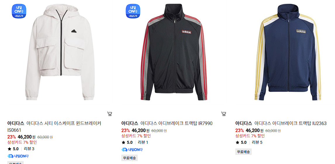 할인 품목 : 운동화, 티셔츠, 자켓 등