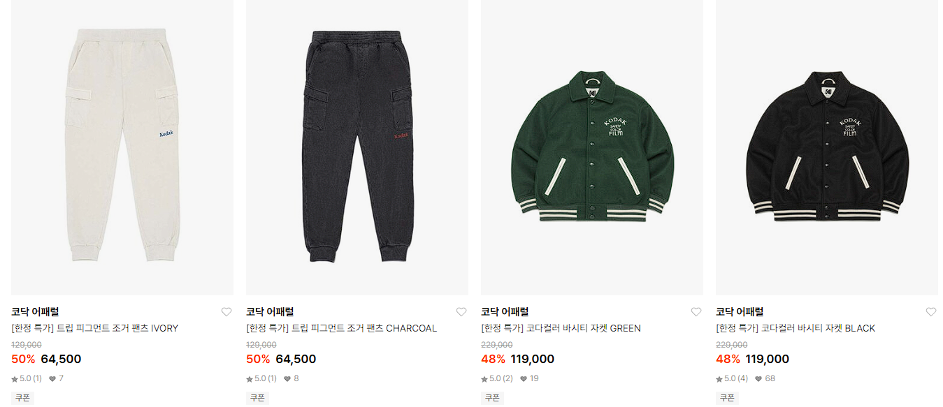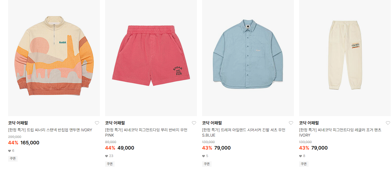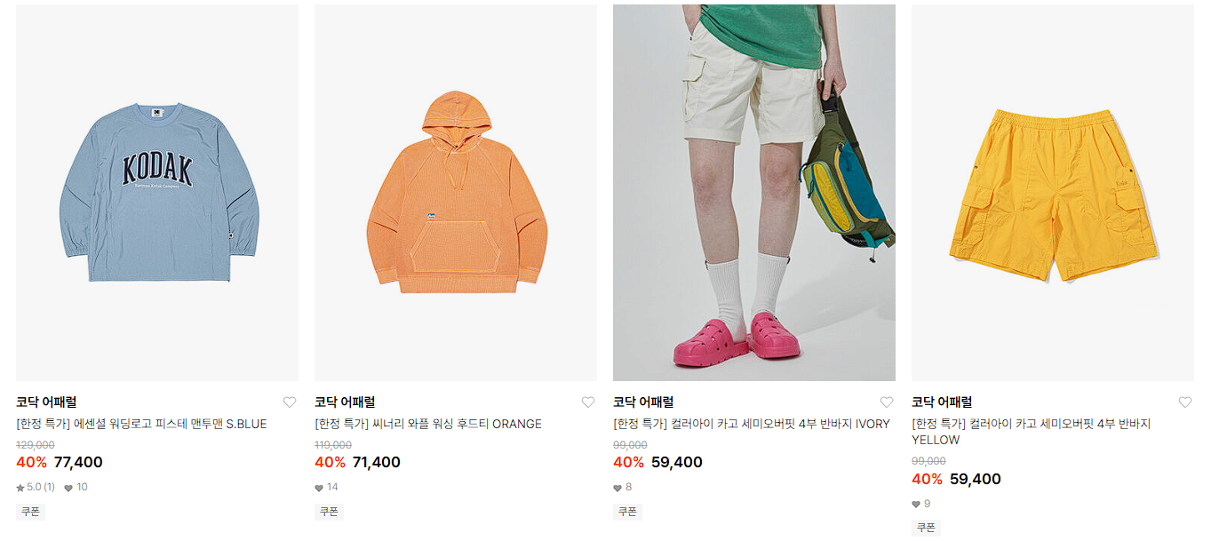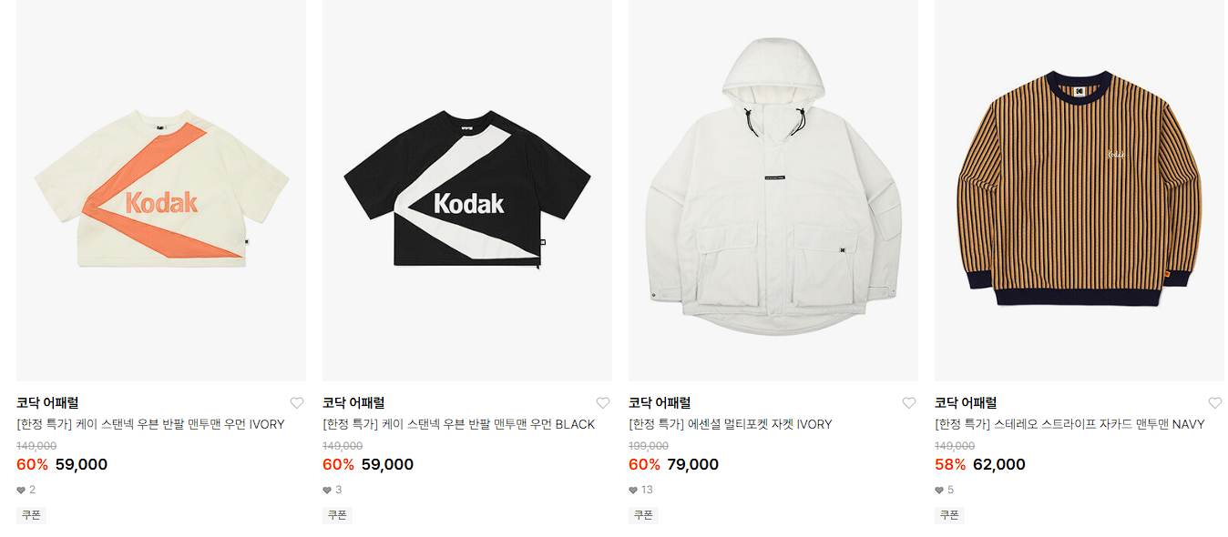 코닥 어패럴 다양한 제품을 할인 판매하네요.