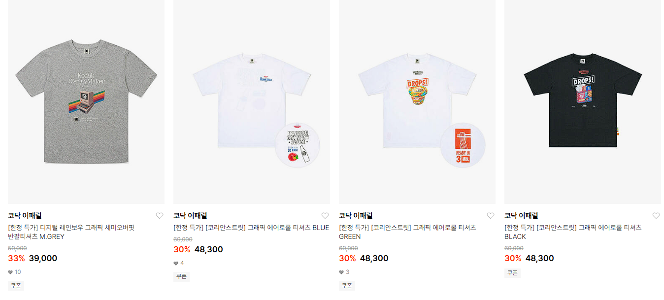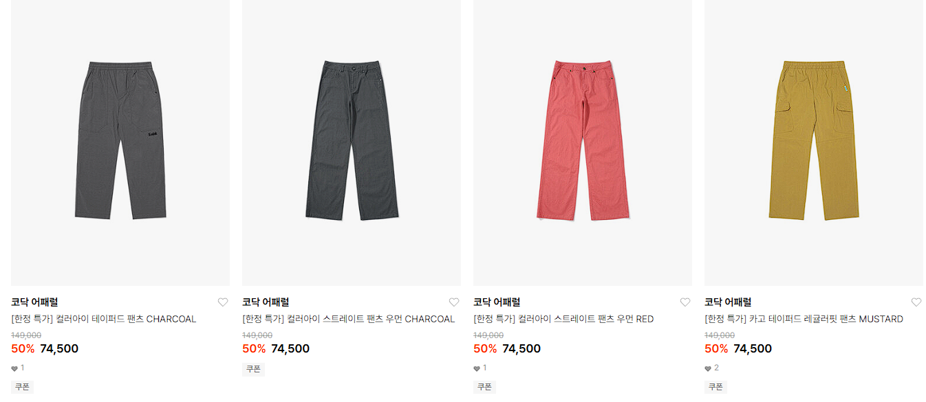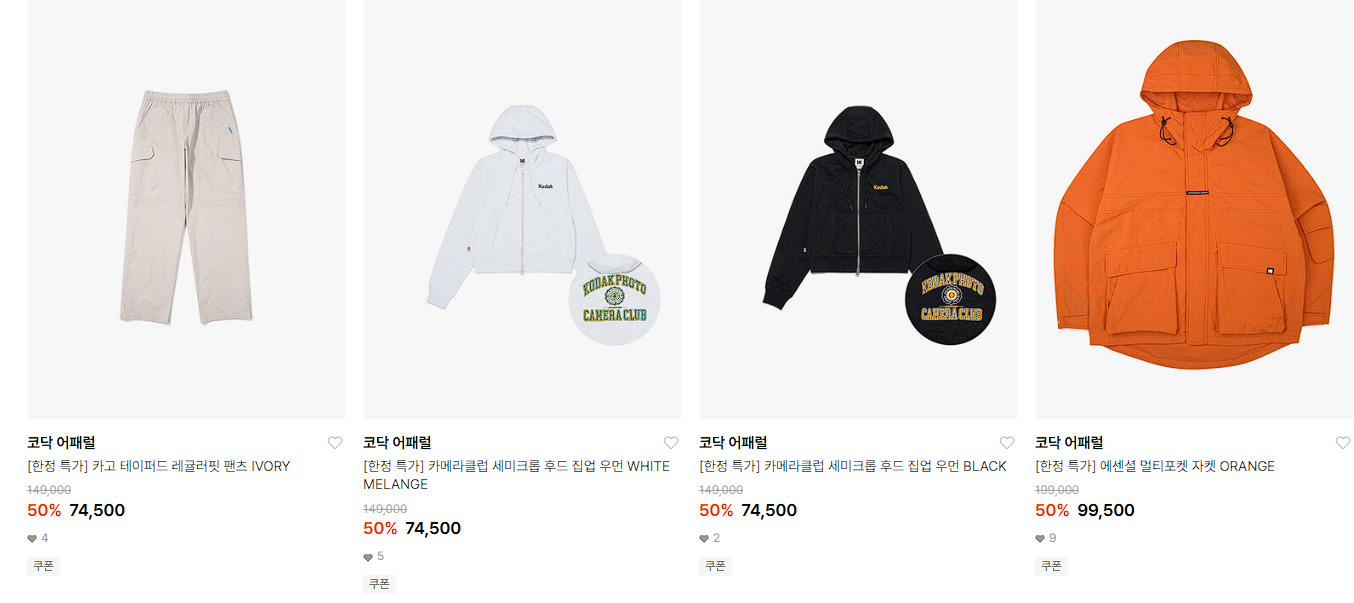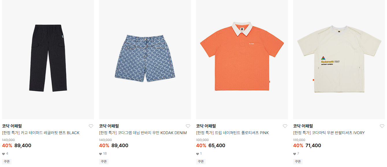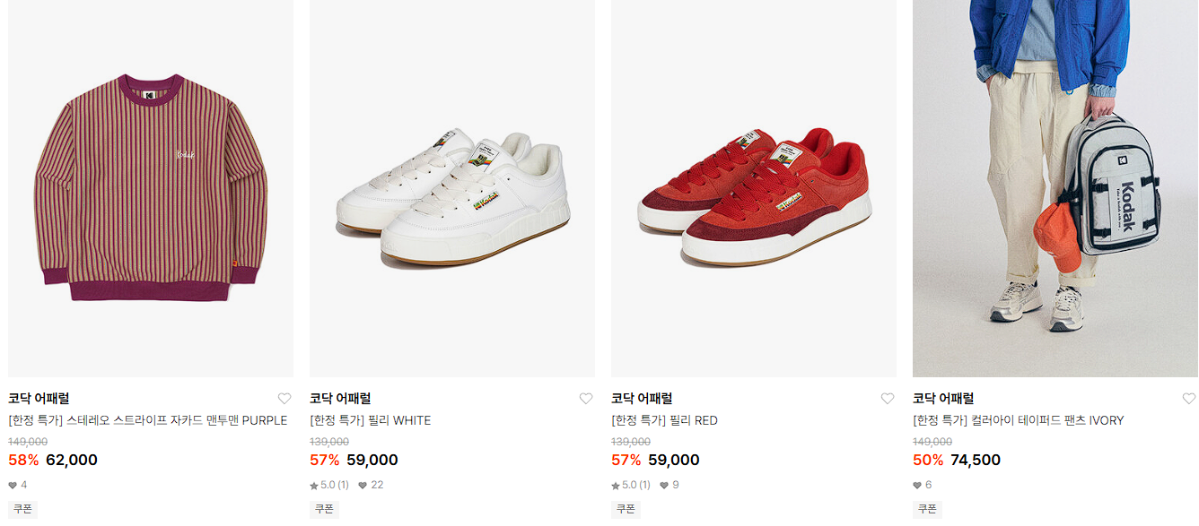 코닥 어패럴 다양한 제품을 할인 판매하네요.