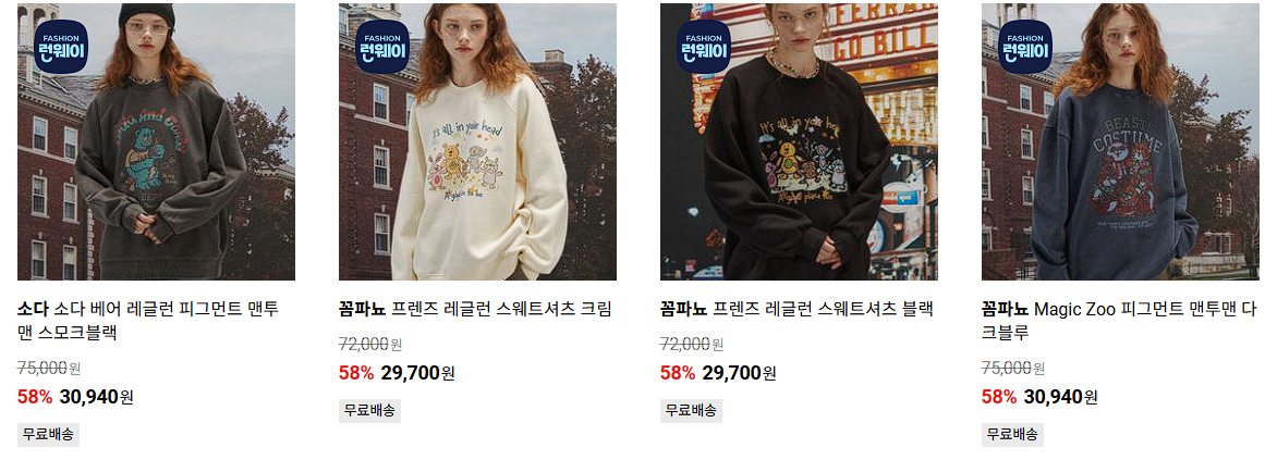 할인 품목 : 맨투맨, 후드티, 팬츠 등
