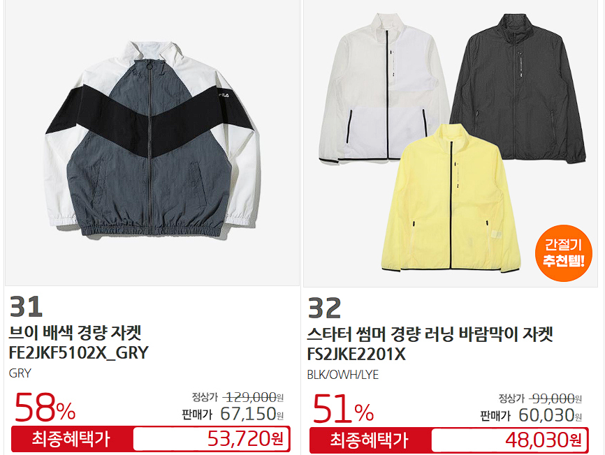 할인 품목 : 운동화, 티셔츠, 자켓 등