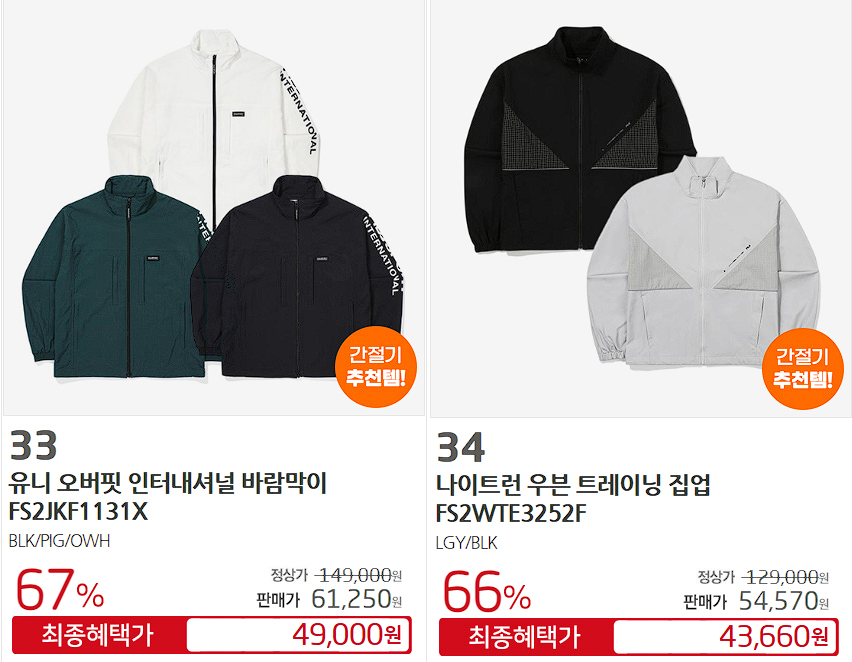 할인 품목 : 운동화, 티셔츠, 자켓 등