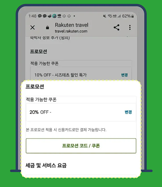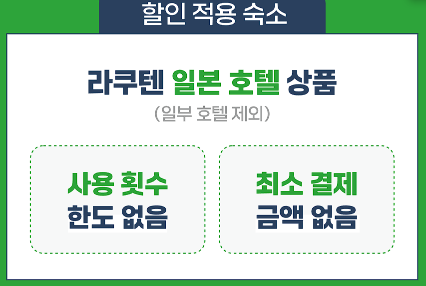 할인 방법: 호텔스컴바인에서 일본 숙소 검색 후 라쿠텐트래블 상품 선택, 결제 페이지에서 할인코드 입력 후 적용