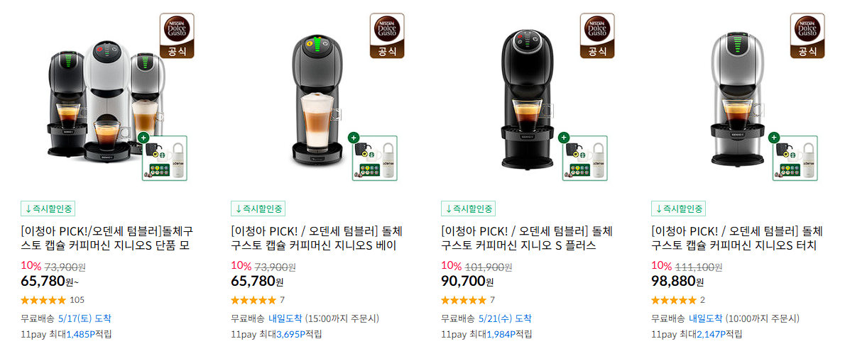 돌체구스토 커피머신 다양한 제품을 할인 판매하네요.
