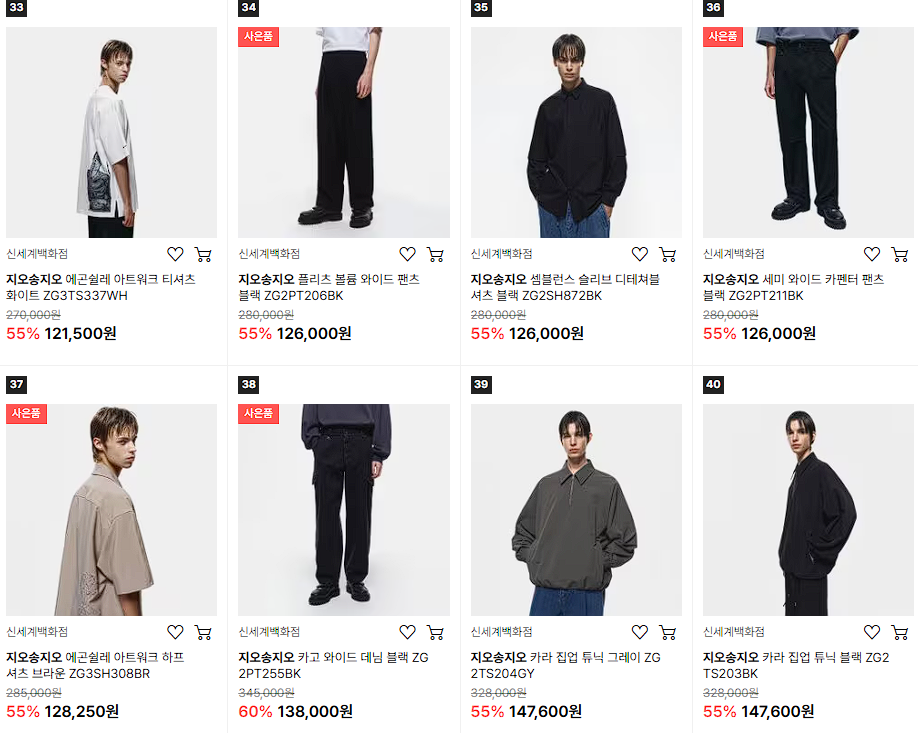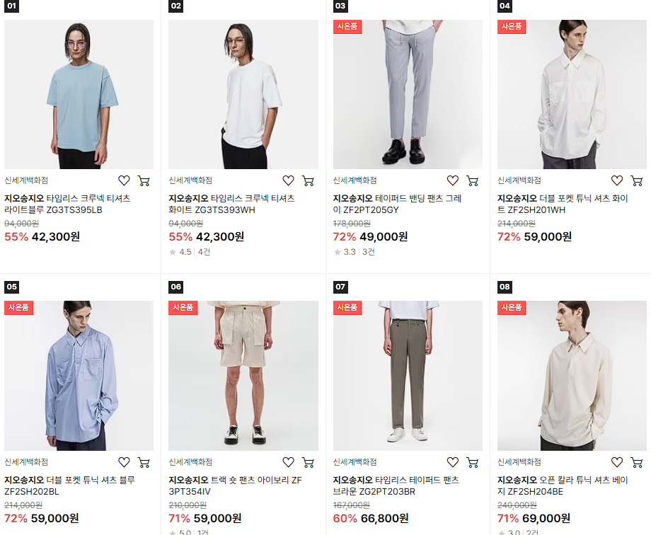 할인 품목 : 티셔츠, 팬츠, 셔츠 등