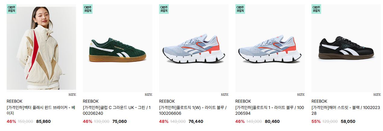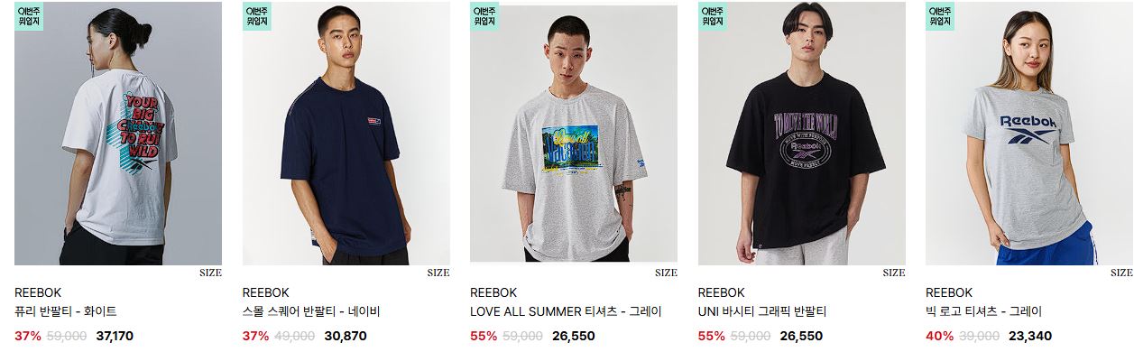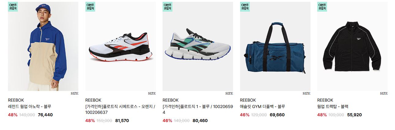 할인 품목 : 운동화, 티셔츠, 가방 등
