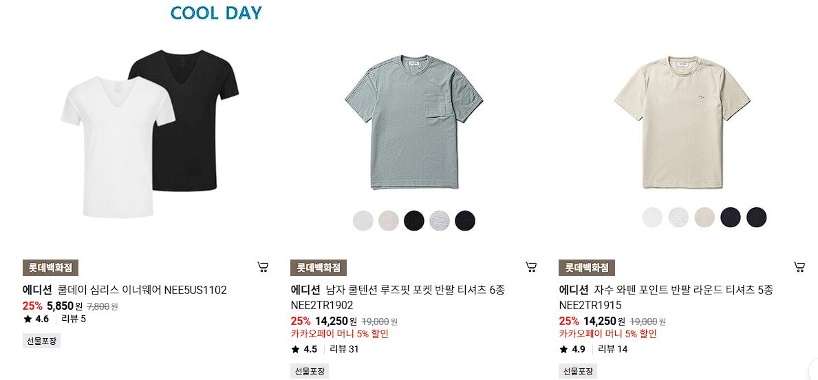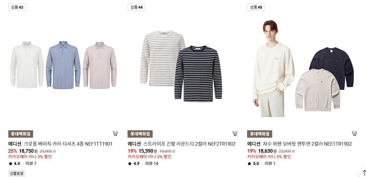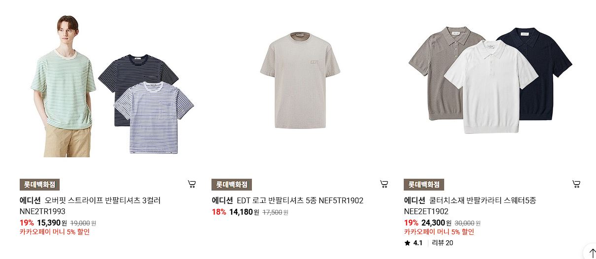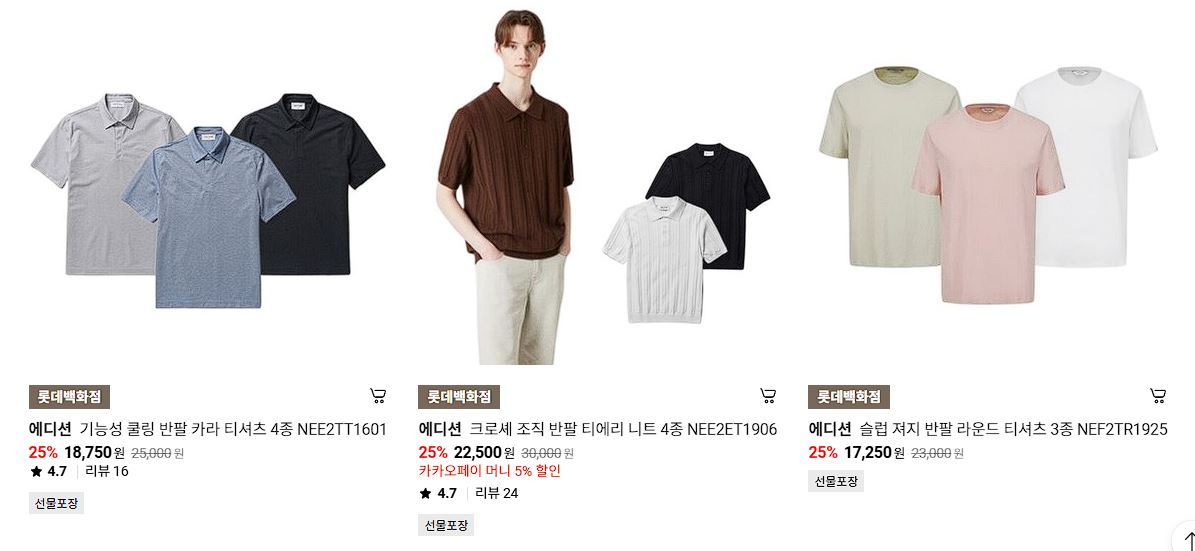 할인 품목 : 티셔츠, 팬츠, 니트 등