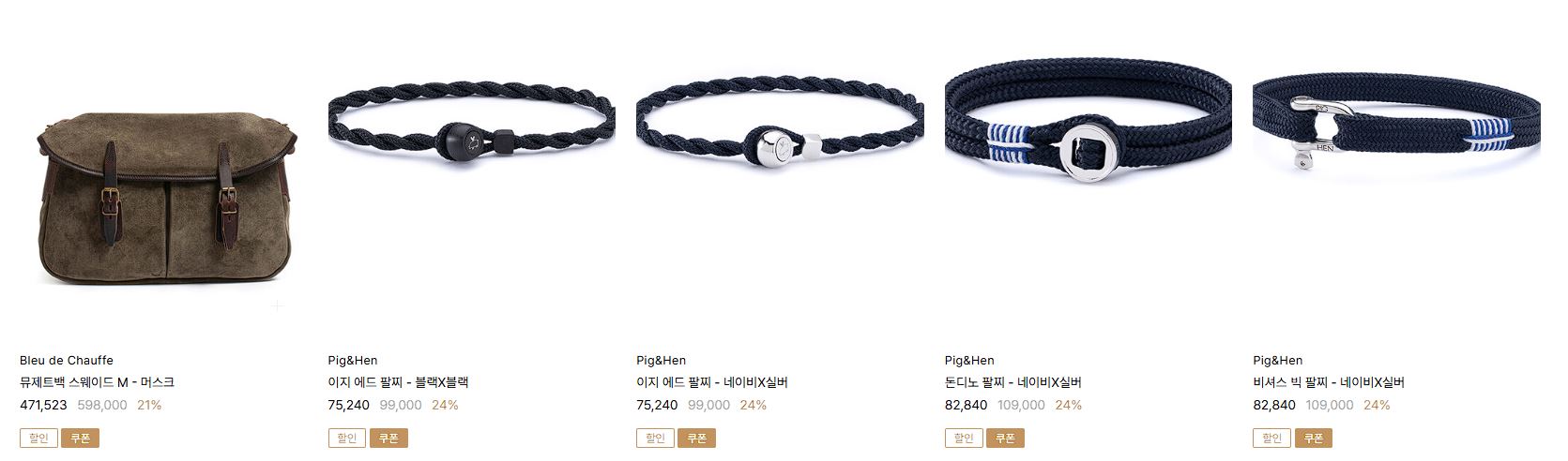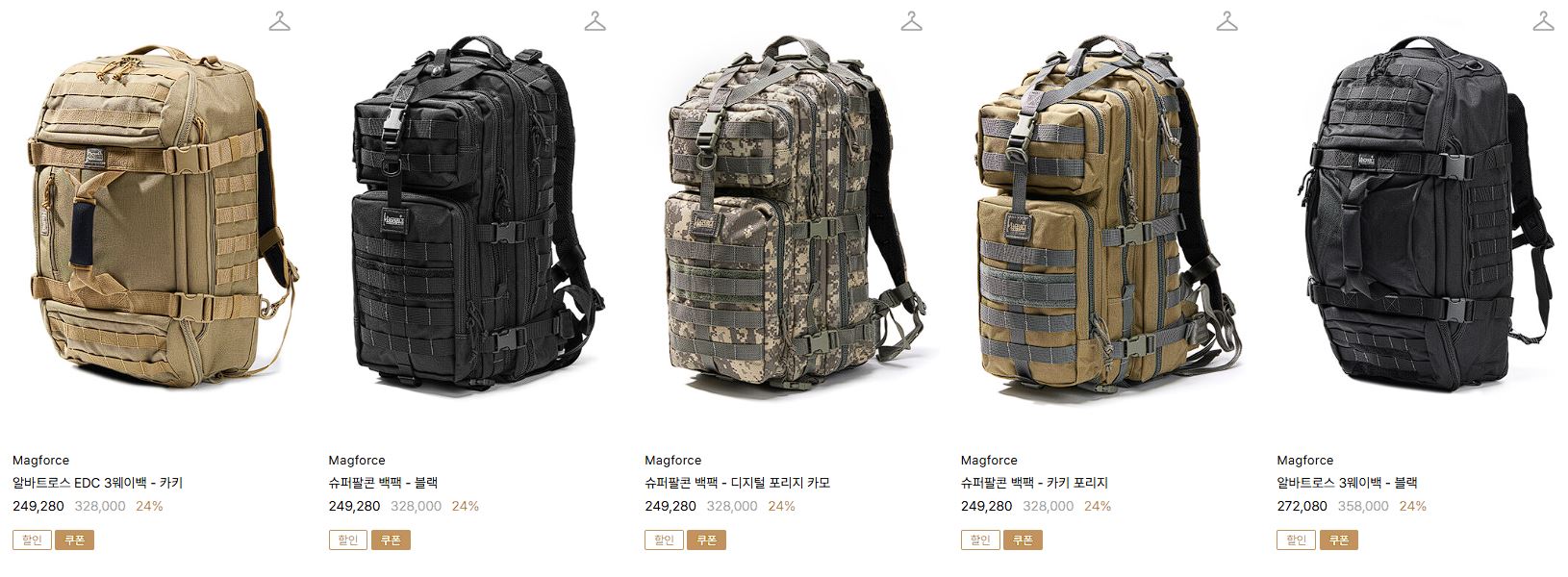 할인 품목 : 티셔츠, 백팩, 팔찌 등