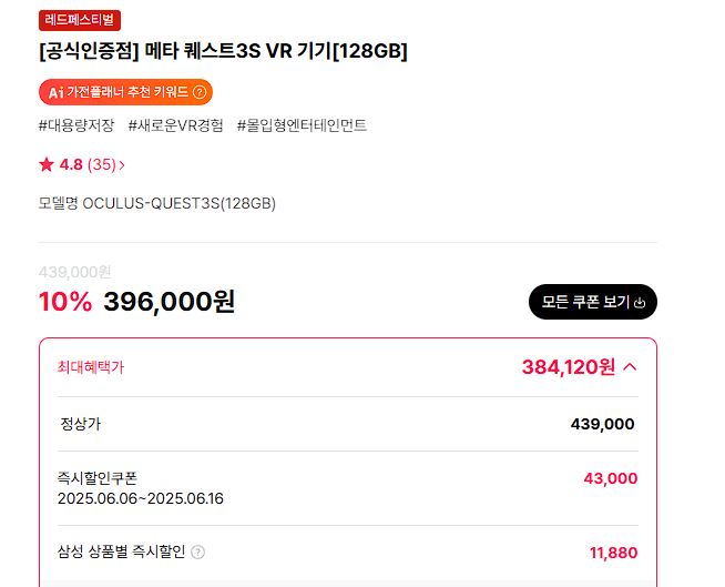 메타 퀘스트3S VR 기기 할인 판매하네요.