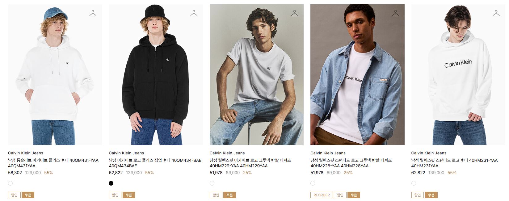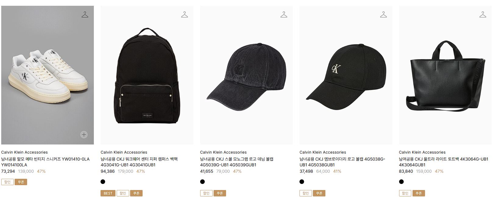 할인 품목 : 티셔츠, 팬츠, 가방 등