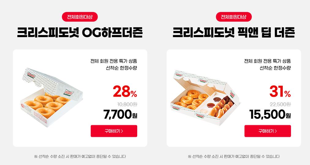 할인 메뉴 : 클래식 치즈버거세트, 크리스피도넛 픽앤 딥 더즌 등