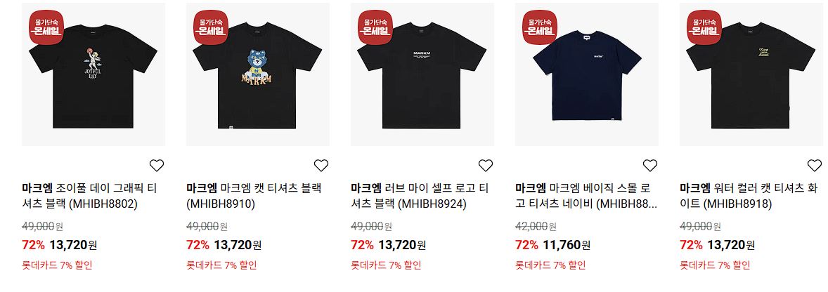 할인 품목 : 티셔츠, 팬츠, 모자 등