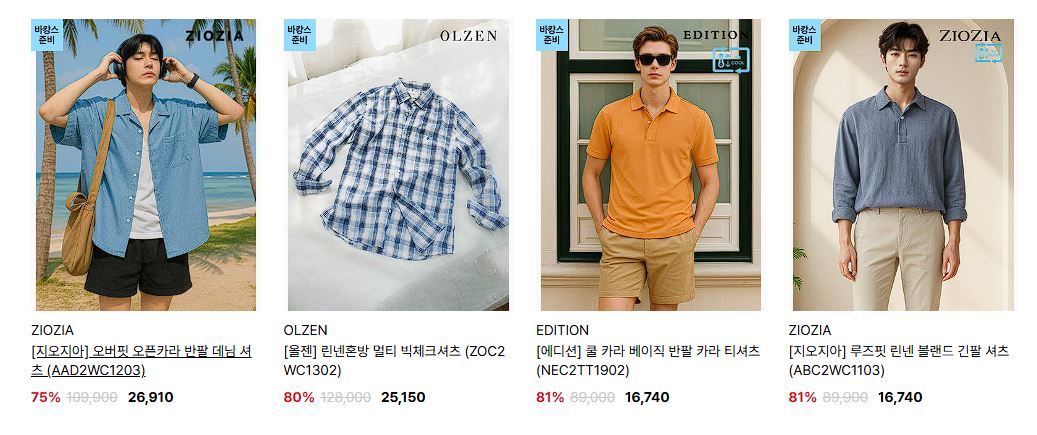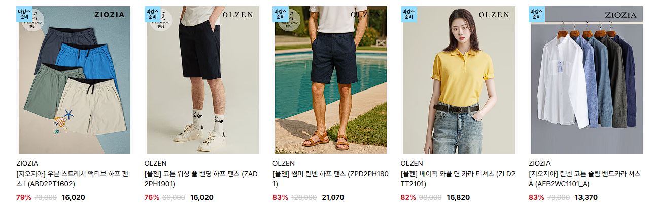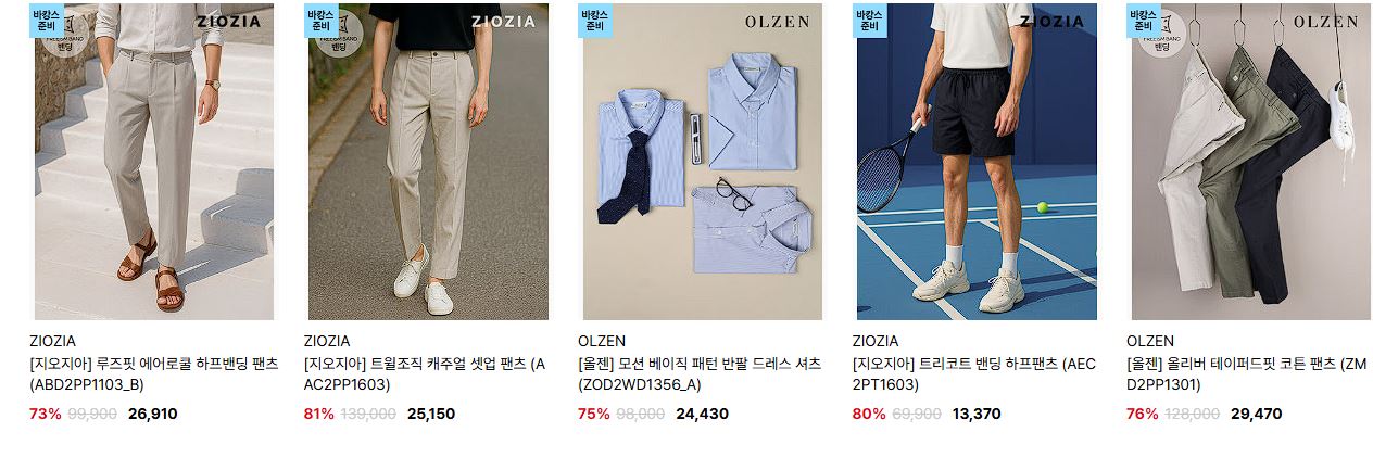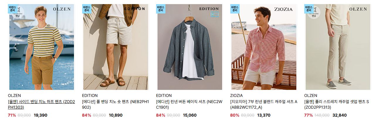 할인 품목 : 티셔츠, 팬츠 등