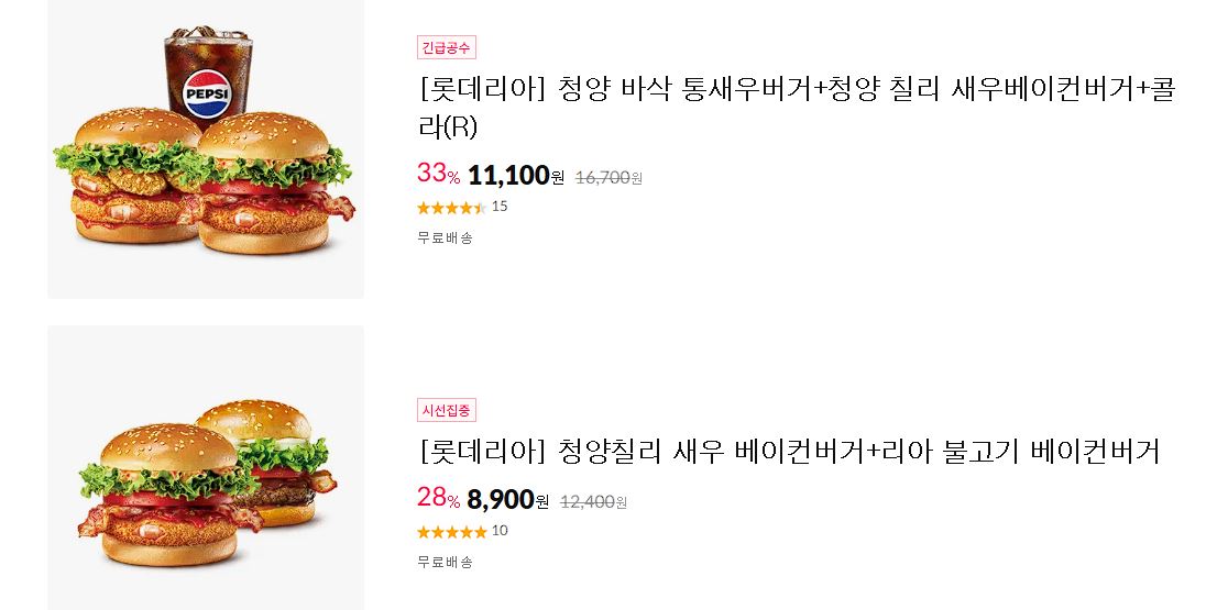 할인 품목 : 청양 바삭 통새우버거, 청양 칠리 새우베이컨버거 등