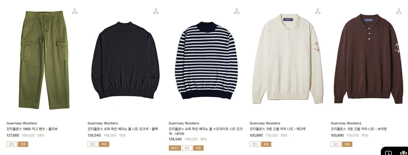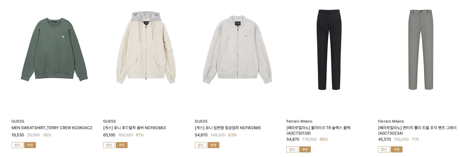 할인 품목 : 티셔츠, 팬츠, 자켓 등