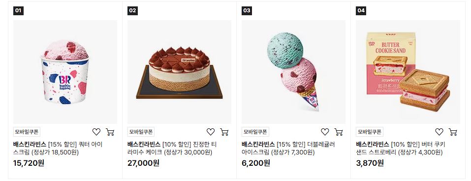 배스킨라빈스 다양한 제품을 할인 판매하네요.