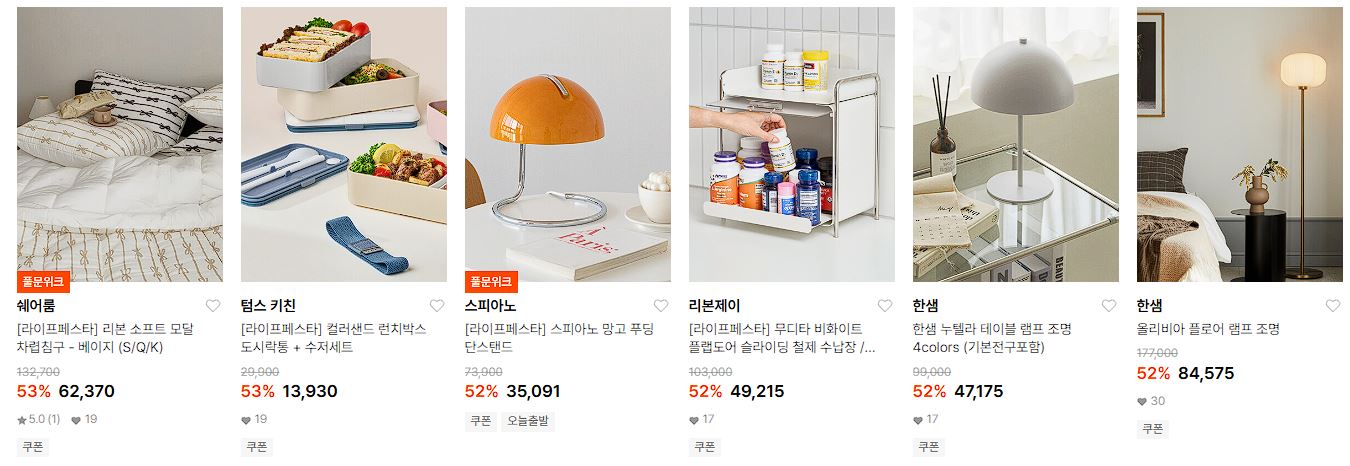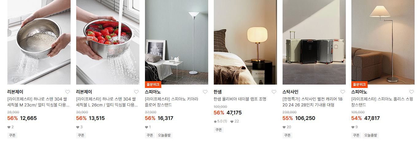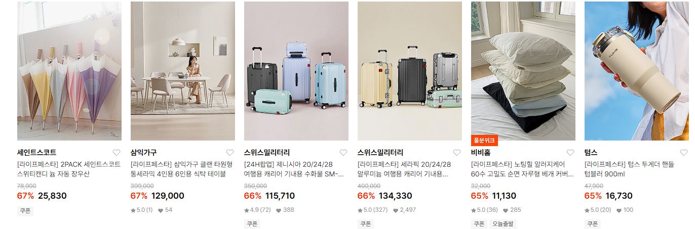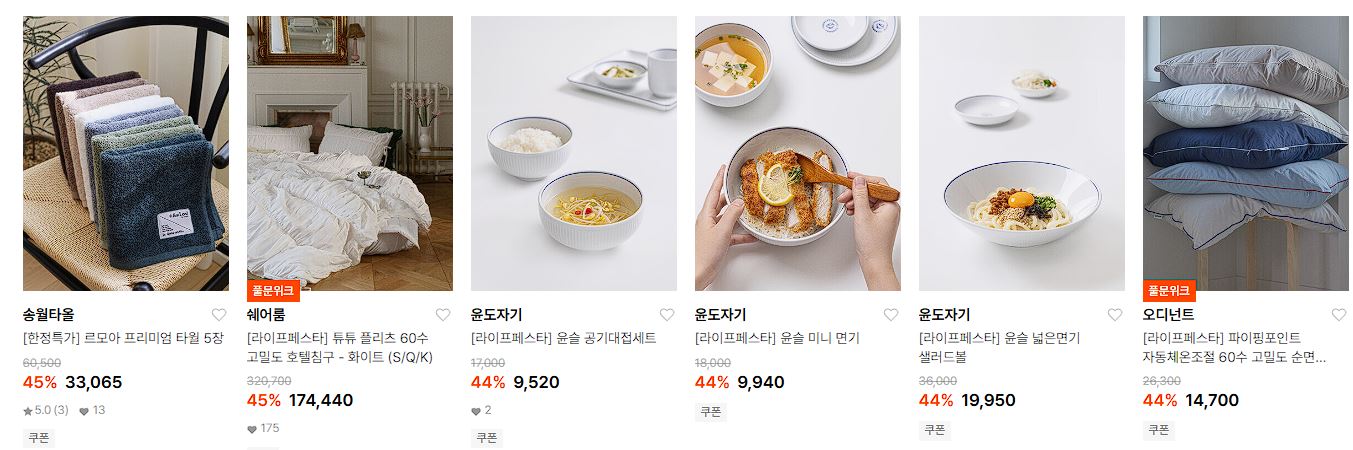 할인 품목 : 타월, 캐리어, 식기, 조명 등