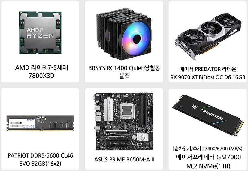 한성컴퓨터 라이젠7 7800X3D RX9070XT 16GB 조립PC 할인 판매하네요.
