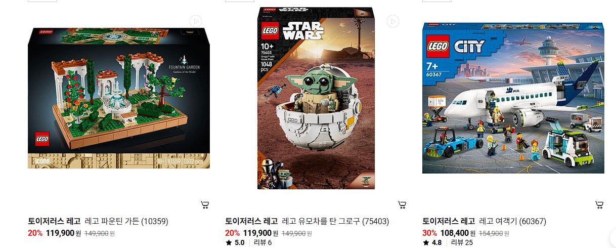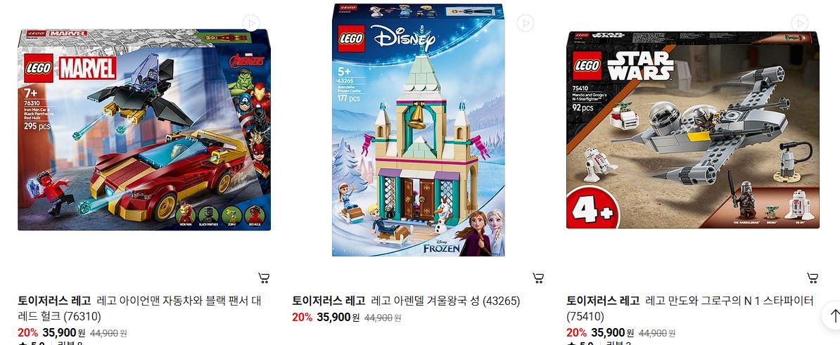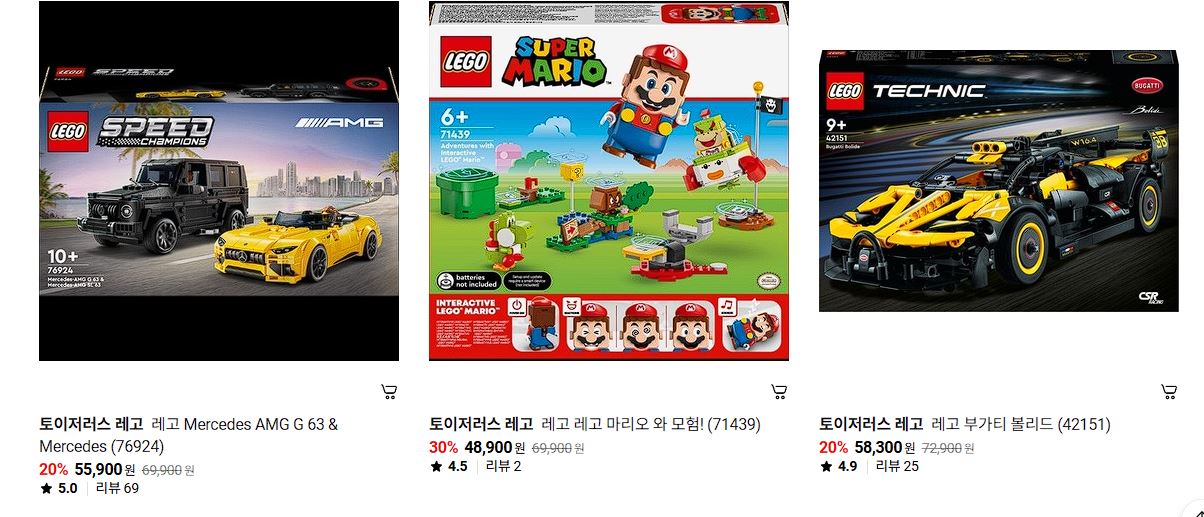 할인 품목 : 자동차, 스타워즈, 슈퍼마리오 등