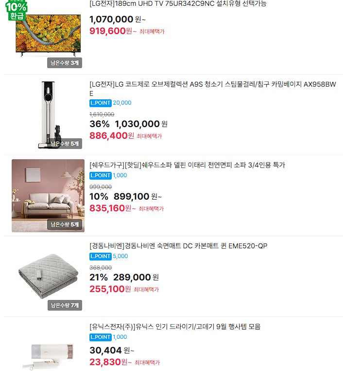 할인 품목 : 청소기, 세탁기 등