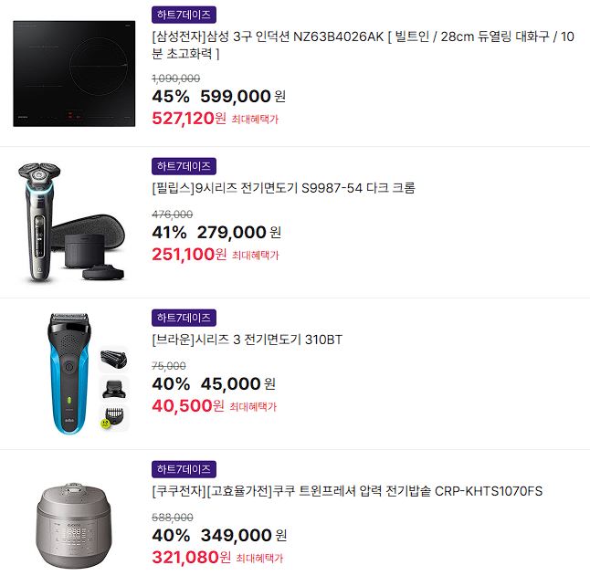 할인 품목 : 식기세척기, 청소기, 면도기 등